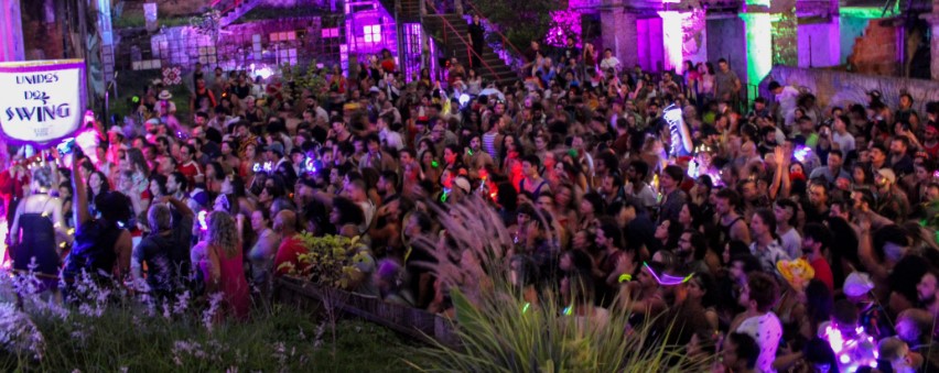Cortejo iluminado com jazz de rua, luzes e performance.